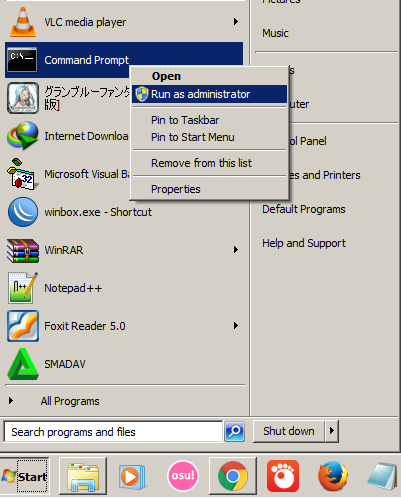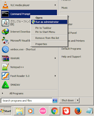 2. Selanjutnya masuk ke command prompt dengan otoritas administrator, caranya adalah dengan klik kanan pada CMD (command prompt) lalu pilih “Run as administrator” ini harus ya