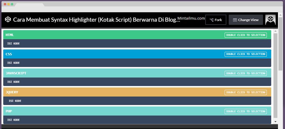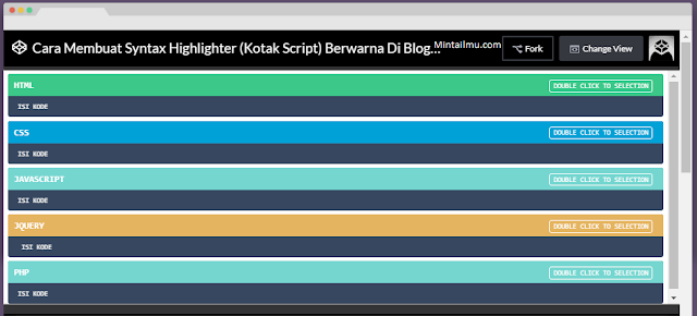 Mintailmu.com – Cara Membuat Syntax Highlighter (Kotak Script) Berwarna Di Blogger – Halo selamat siang, kali ini saya akan memberikan tutorial tentang anda bagaimana cara membuat Syntax Highlighter pada blogger. Syntax Highlighter hampir mirip dengan blockquote atau codepen, namun tampilan dari Syntax Highlighter lebih rapi dan bisa kita atur sesuai keinginan. Syntax Highlighter sudah banyak digunakan oleh para blogger untuk membungkus kode atau script mereka mulai dari kode CSS, HTML, Java Script, PHP, Jquery dan code lain-lainnya.