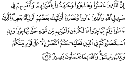 “Sesungguhnya orang-orang yang beriman dan berhijrah serta berjihad dengan harta dan jiwanya pada jalan Allah dan orang-orang yang memberikan tempat kediaman dan memberi pertolongan (kepada Muhajirin), mereka itu satu sama lain saling melindungi. Dan (terhadap) orang-orang yang beriman tetapi belum berhijrah, maka tidak ada kewajiban sedikit pun bagimu melindungi mereka, sampai mereka berhijrah. (Tetapi) jika mereka meminta pertolongan kepadamu dalam (urusan pembelaan) agama, maka kamu wajib memberikan pertolongan kecuali terhadap kaum yang telah terikat perjanjian antara kamu dengan mereka. Dan Allah Maha Melihat apa yang kamu kerjakan.” (Q.S. Al-Anfal 18:72)