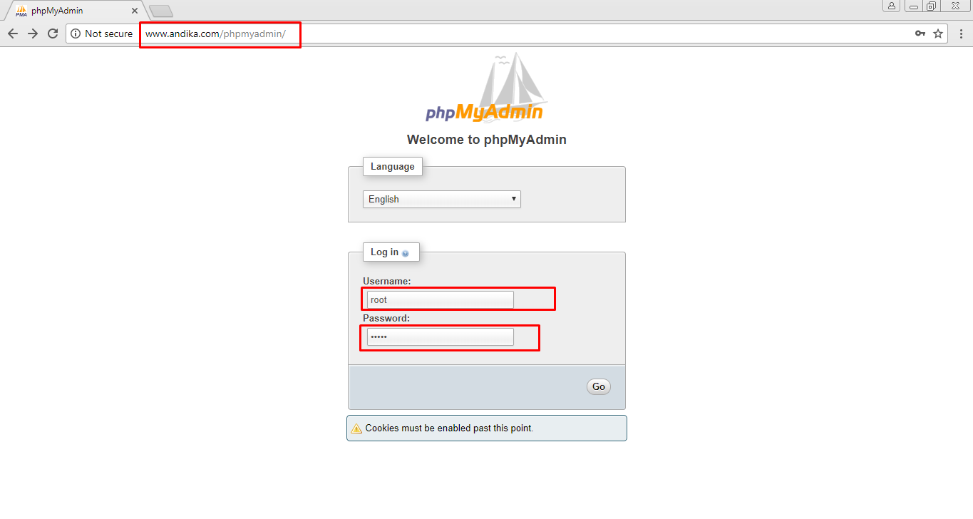 24. Selanjut nya kita masuk ke browser dengan perinta www.andika.com/phpmyadmin , username nya root dan masukan password yang tadi.