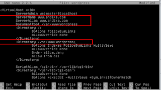 19. Kemudian kita masuk ke dalam wordpress dengan perintah nano wordpress , tambahkan ServerName www(domain kita) ServerAlias www(domain kita) , tambahkan DocumentRoot /var/ww/wordpress dan tambahkan juga <Directory /var/www/wordpress> seperti contoh gambar dibawah ini.