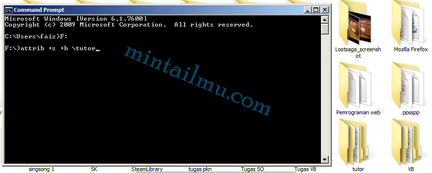 - Jika kalian ingin memunculkannya kembali caranya sangat gampang, tinggal ketikan lagi perintahnya namun tanda “+” diganti dengan tanda “–” alias “attrib -s -h tutor”