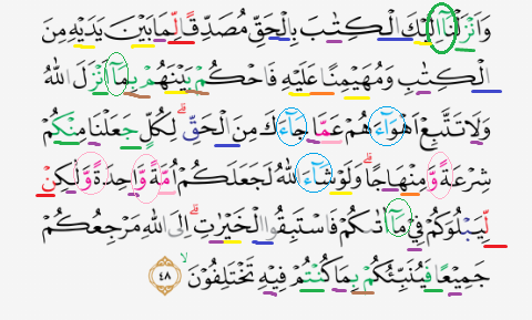 Berikut adalah Tajwid Surat Al Maidah Ayat 48 , yang telah diawali dengan tanda garis dilanjuutkan dengan tanda lingkaran